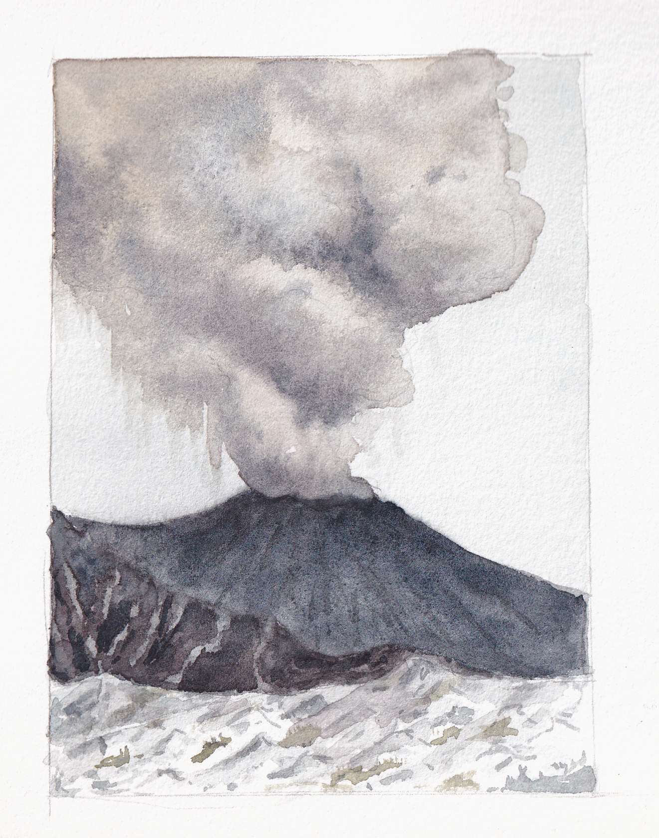 De temps en temps des panaches de fumée sortent du volcan que les nuages accrochent ponctuellement