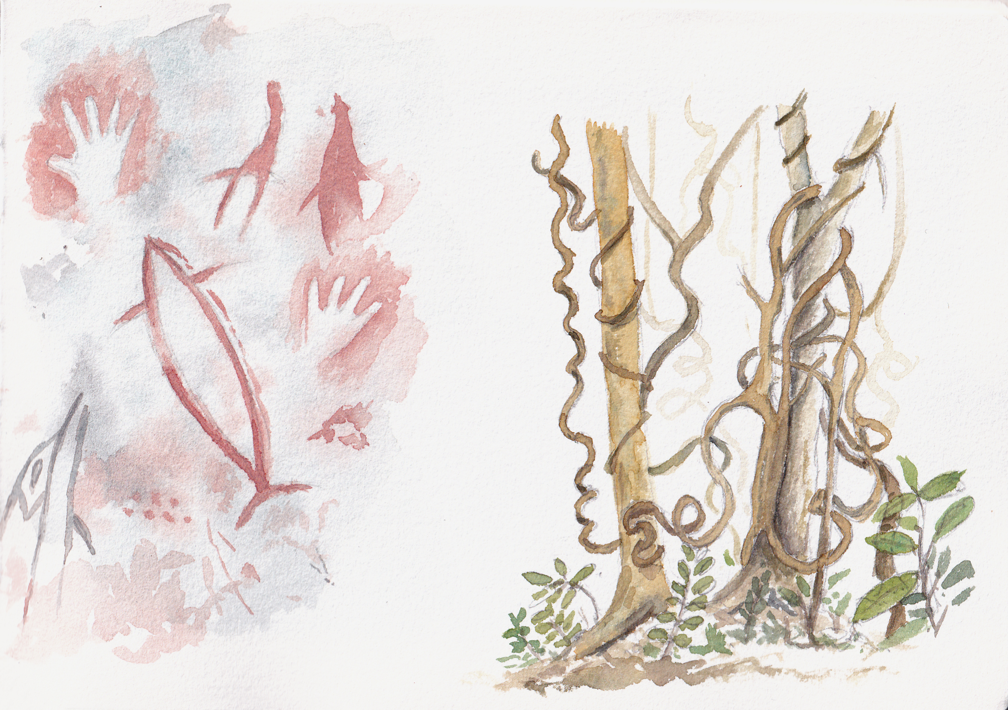Nous avons nos buffs et des gants pour nous protéger du soleil. La pluie de la nuit a changé les couleurs, les roches sont plus noires. Nous visitons un site rupestre avec de belles peintures et une petite grotte avec des grappes de grosses chauves-souris au plafond qui volent dans tous les sens.