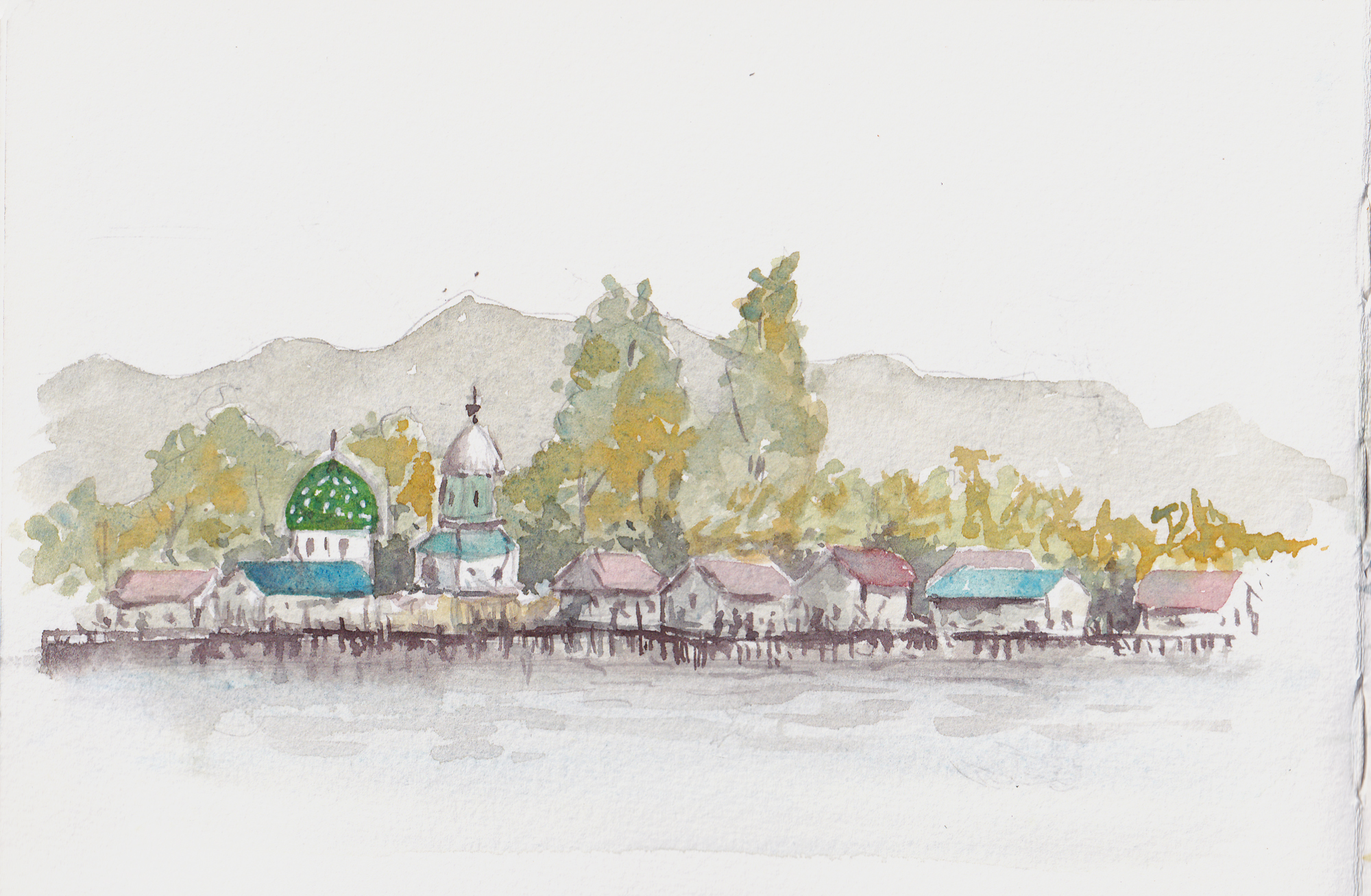 Réveil à 5 h. Il a encore plu une bonne partie de la nuit. Nous partons en bateau avec arrêt dans un village musulman, Usaha Jaya, qui semble assez pauvre. Je suis toujours un peu mal à l’aise. C’est un village sur pilotis, la marée basse fait apparaître les détritus. Les enfants nous suivent, contents de voir du monde…